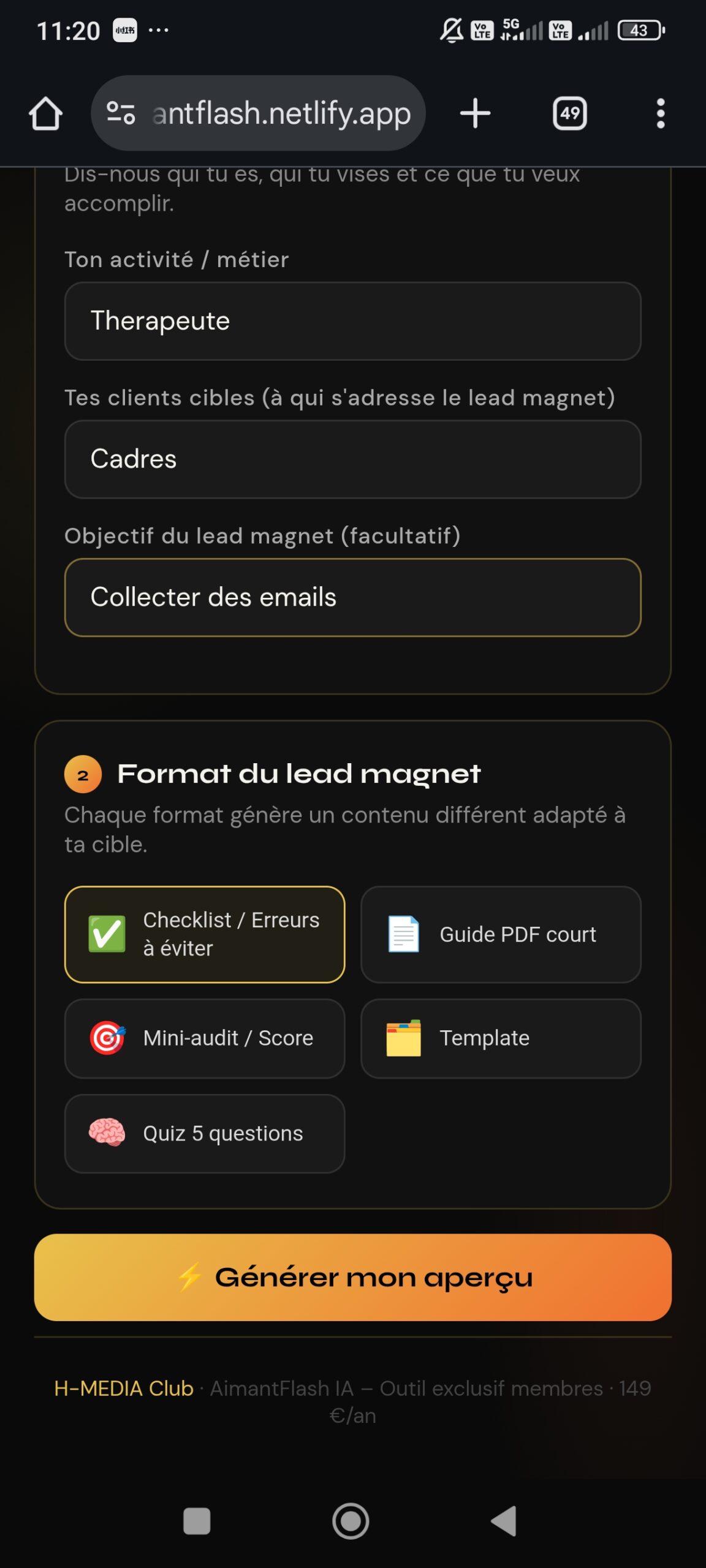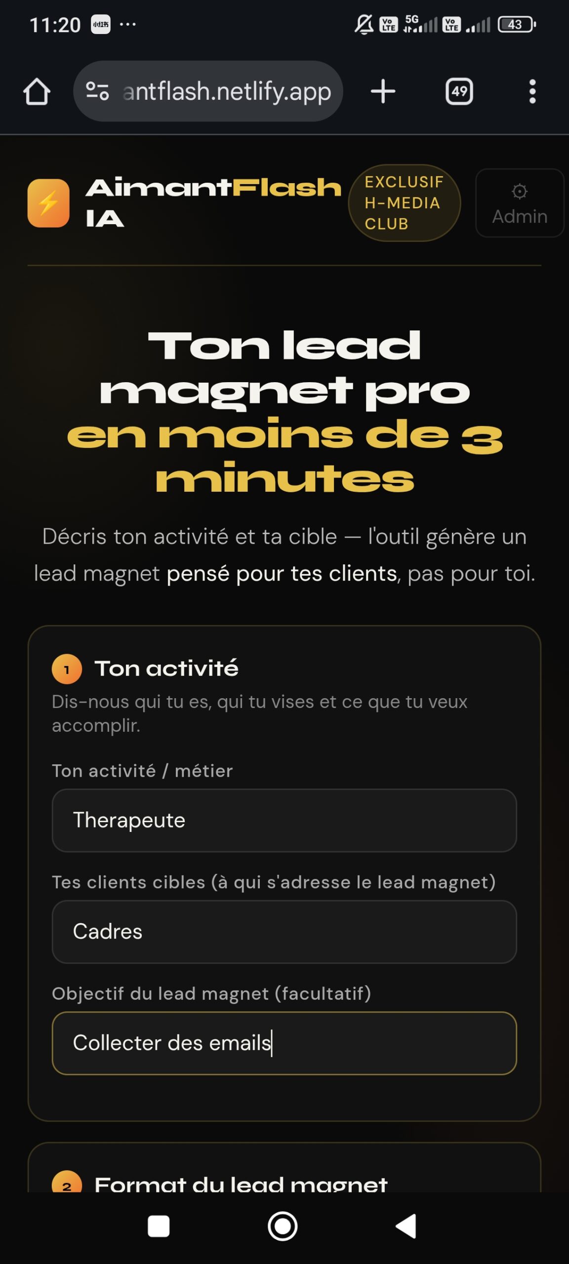 L’outil IA qui va te permettre de convertir tes prospects éventuels en client en leur offrant un cadeau gratuit. Le concept de lead magnet c est avoir un cadeau en échange d une information. AimantFlash vous aide a communiquer aupres de votre cible et vous aide à ce générer ce fameux cadeau